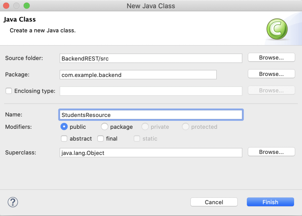 I am using the same project BackendREST from Part-I of this tutorial. In the src folder–> in com.example.backend –> create a new class. Name it Student.java