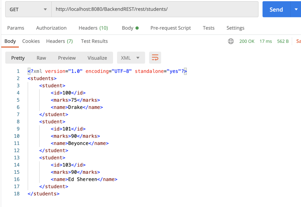 let’s try a GET request – In your postman dashboard –> type in your URL as http://localhost8080/BackendREST/rest/students/ —> select GET from the drop down and click on send. You should see the result in the body section in XML format.