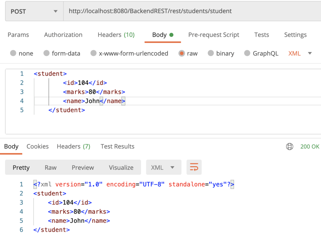 Let us also try POST — We will add student by name “John” , id – 104 , marks -80 –> select POST from the dropdown –> type in the URL http://localhost8080/BackendREST/rest/students/student (students/student is the path hierarchy for adding a student)–> click on send