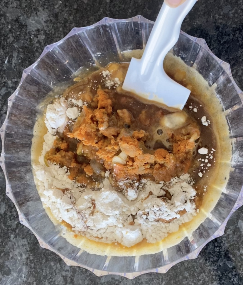 Step 3: Now, add the egg mixture, fruit pulp and oil to the dry ingredients bowl and fold the batter till the ingredients are combined. Do not overdo the mixing.