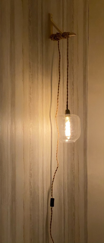 Place the hanger on a smooth even surface and fit it with a screw. I used 3/4 inch screw on a dry wall. Place the hanger right above the electric socket, so that the rope wire doesn’t dangle unevenly. Now, plugin the rope wire, bring it up and wrap it around the hanger till the desired height of your light. Now, fix in your globe and then the light bulb.