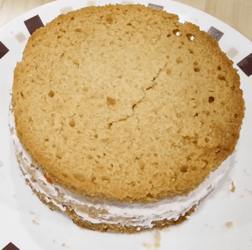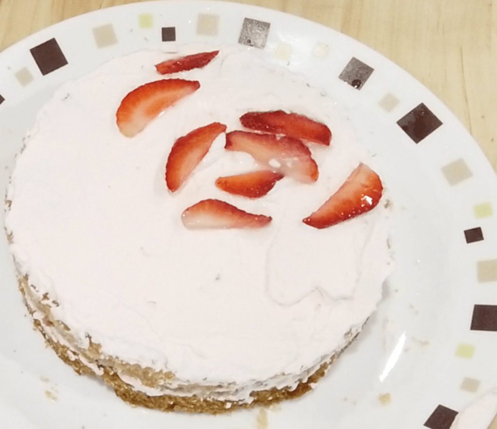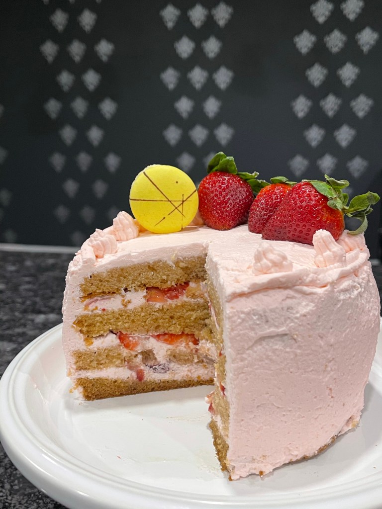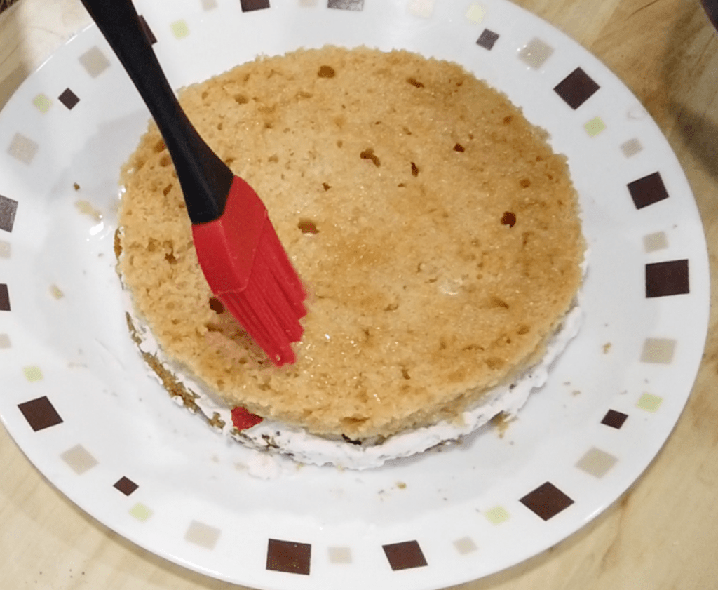 Step 6: For your cake to taste soft and flavorful, slice your cake to layers (for my 6 inch cake I sliced it to half) On your first layer brush sugar syrup and now apply a layer of the frosting add fresh cut strawberries and then top it with another layer of cake and repeat the toppings. You can repeat the same for as many layers you may have.