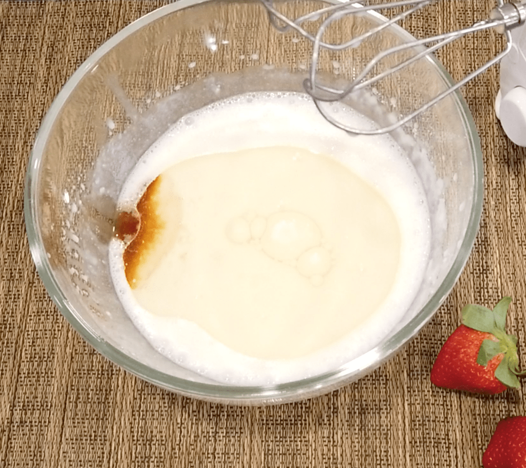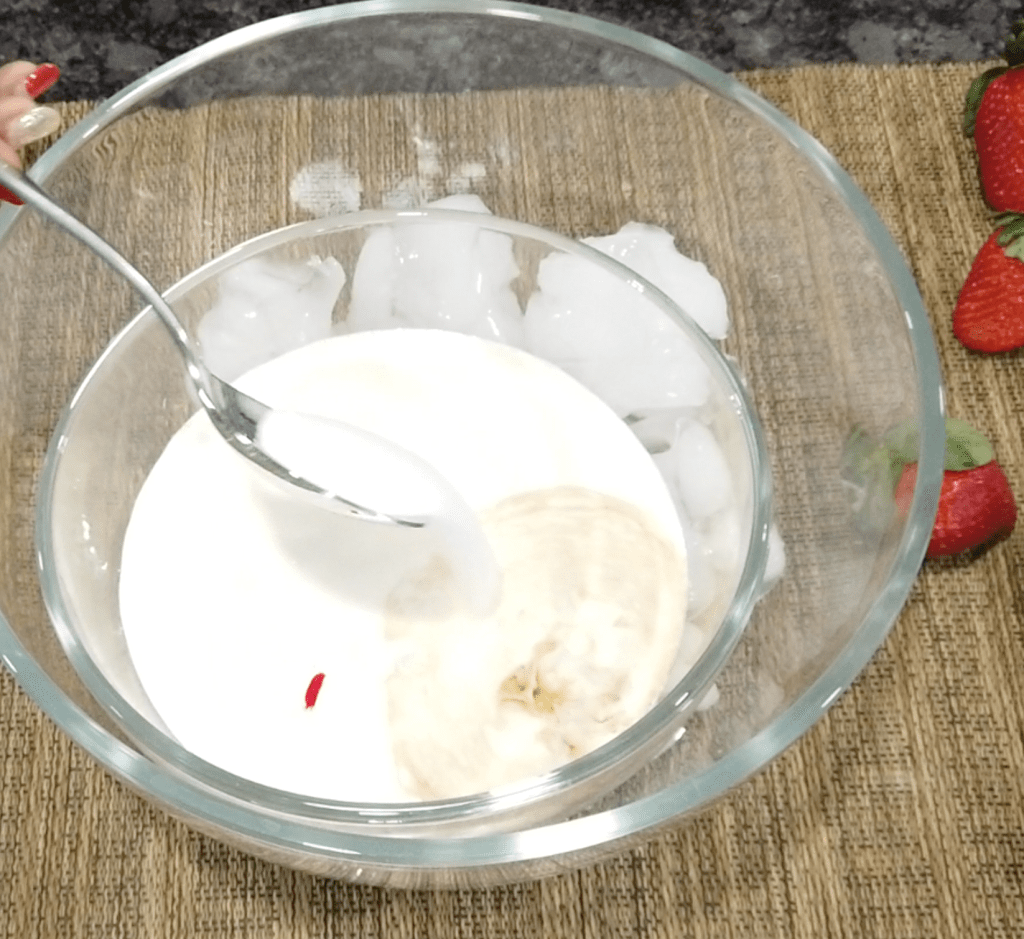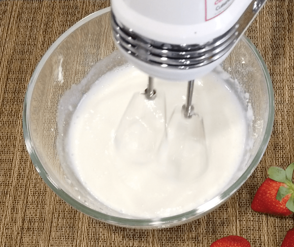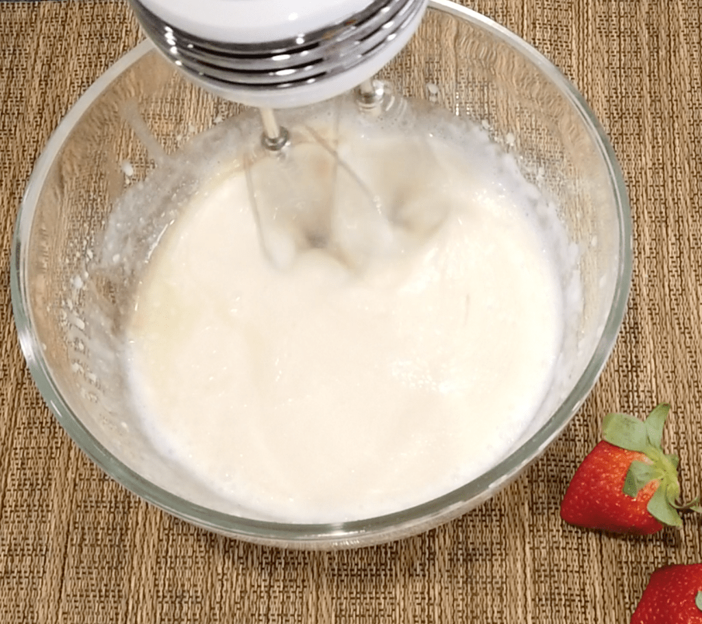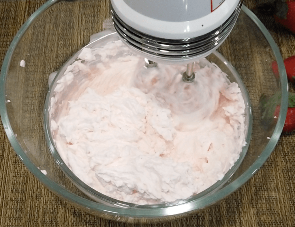 Step 5: For the frosting – You will need a large bowl filled half with ice cubes place another bowl in it. Now add 1/2 cup of whipping cream, vanilla essence, one drop of color (optional) and icing sugar 2 Tbps. Whip the cream using the whipping machine for about 5-6 minutes until the cream forms soft peaks.