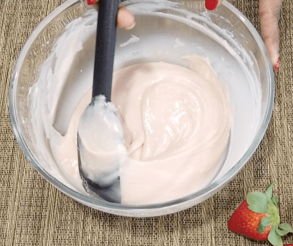 Step 2: Now add Oil, Strawberry Emulsion and Vanilla Essence to the Curd mixture and whisk till the Oil is combined.
